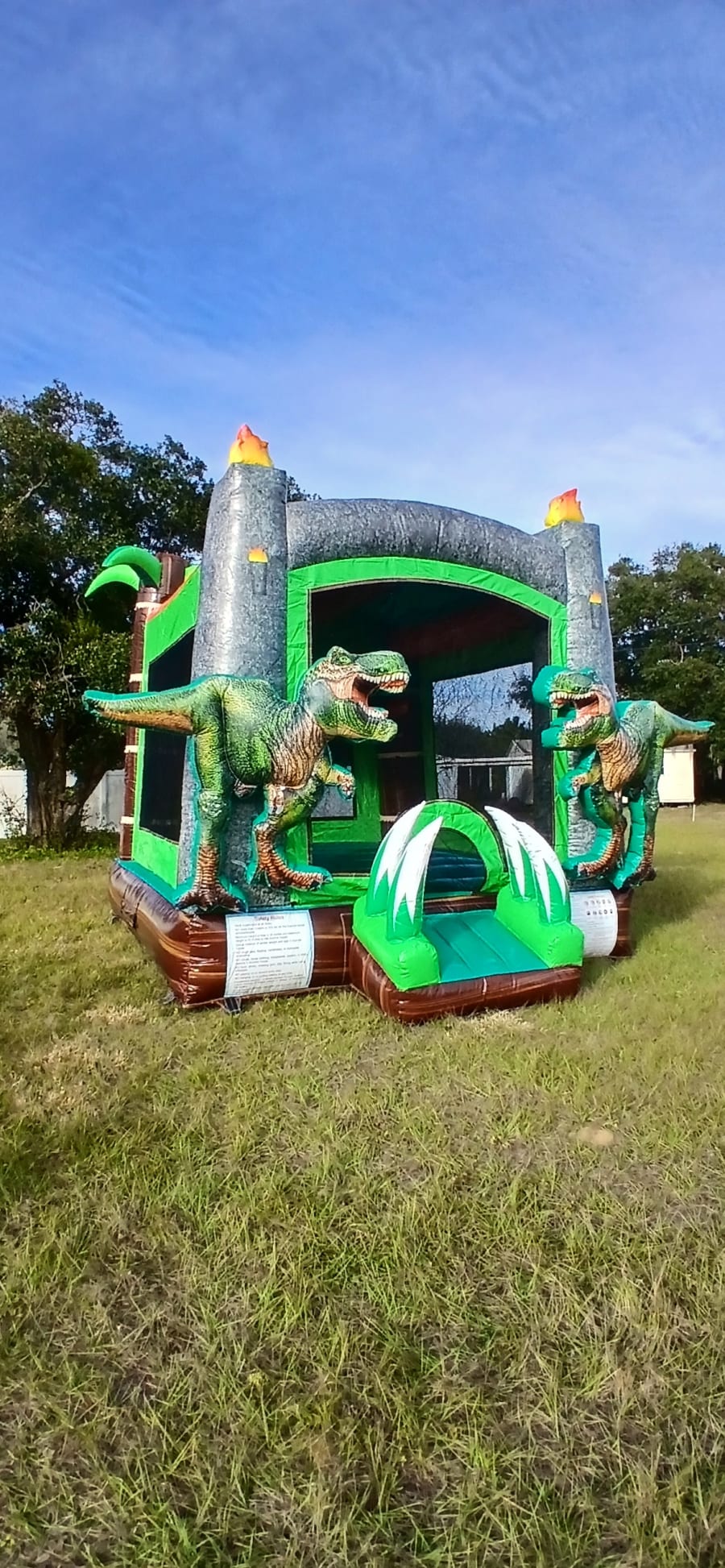 Bring prehistoric fun to your next event with the Bounce house Dino-Mite Bounce. This eye-catching dinosaur bounce house features a teeth-lined entrance and two giant dinosaurs greeting kids at the door. It offers a large play and jumping area plus two built-in basketball hoops for extra action. Perfect for a Boys Birthday Party, church event, or festival. Fast setup. Big smiles. Great time guaranteed. ππ