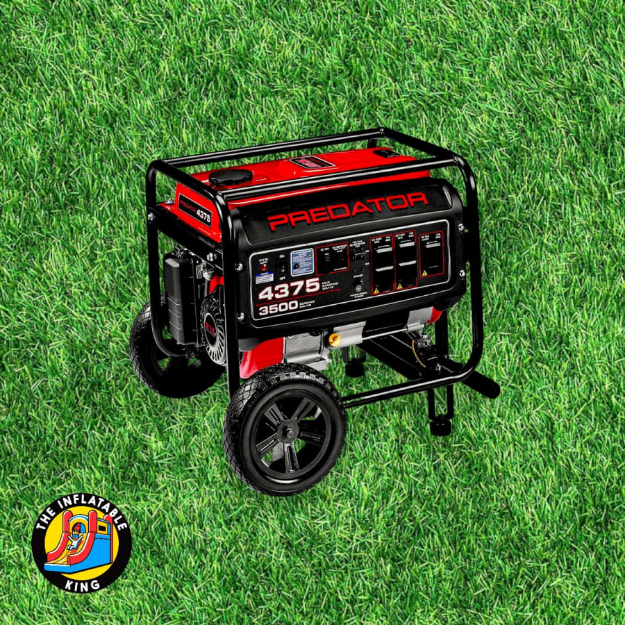 "This Predator generator is available for rent if you do not have the power requirements at your home or event space. Capable of running two bounce houses or other inflatables simultaneously, it's perfect for ensuring your event goes smoothly. With a run time of up to 16 hours on a single inflatable rental, you can rely on it throughout your event. Additionally, the generator operates quietly, allowing you to place it discreetly around the back side of the unit. This way, you can enjoy your time in the sun without excessive noise.