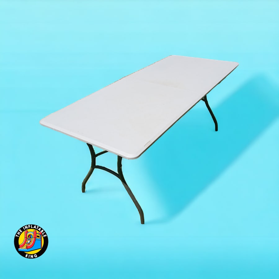 Introducing our 6-Foot White Plastic Table, the perfect addition to any event or party hosted by The Inflatable King, LLC. Convenient, durable, and easy to set up, this table is essential for all your gatherings.