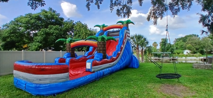 Make a splash at your next event with the 18ft Baja Splash Single Lane Water Slide — a tropical-themed inflatable that brings high-energy fun for kids, teens, and adults! This vibrant red, blue, and palm-decorated water slide features an exciting single-lane descent and a refreshing splash pool landing, perfect for beating the Florida heat.