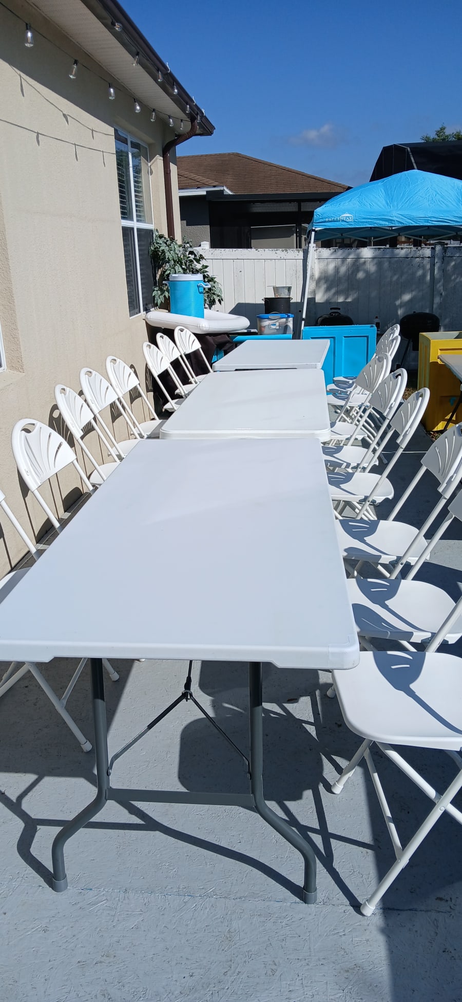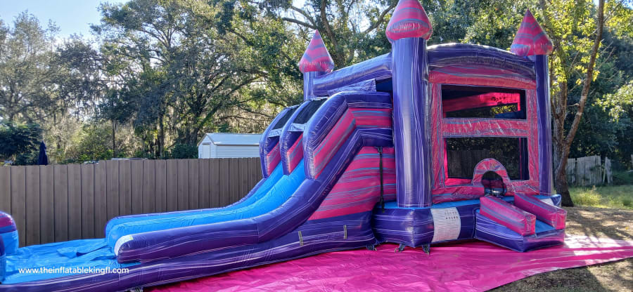 This package includes the XL Royal Purple Castle Bounce House combo, along with 2 tables, 12 chairs, and the Jumbo Connect 4.